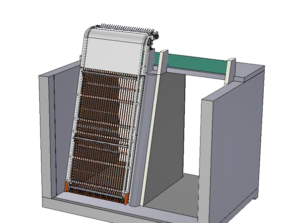 回转式清污机是将拦污与清污结合为一体的固定式清污设备。栅体底端设有辅助拦污栅,防止污物从渠底空档直接通过。齿耙装在两条牵引链条之间绕栅体回转,由于齿耙上的每个耙齿都插入栅条一定深度,故栅面上的污物强制随齿耙运动,将污物从栅体上游面自下而上梳上来,当齿耙转到栅体顶部,牵引链条换向时,齿耙也随之翻转,此时齿耙上的污物脱落到与之配套的皮带输送机上,送至用户指定位置,方便用户进行集中清理,或者污物滑落到工作桥上,由工作人员清理,实现自动清污的目的。
